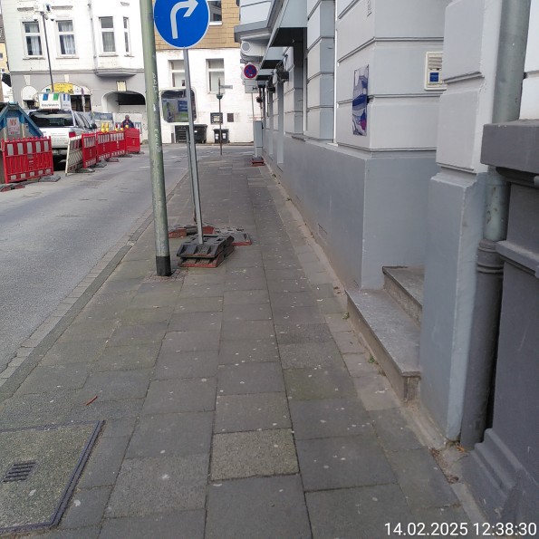 Ist natürlich ein kein Einzelfall aber exemplarisch für das Fehlverhalten bei Baustellen. Erst einmal ist es völlig hirnrissig das Schild mit dem Hinweis auf eine Abbiegepflicht an diese Stelle zu stellen. Hinter einen Laternenmast, wo man es leicht übersieht. Der Laternenmast hätte sich angeboten oder der eh vorhandene Schilderpfahl, an dem die Straßennamen hängen. Dann stehe an genau der Stelle weitere Schilderfüße, welche den Gehweg unzulässig einengen. Die Mindestbreite von Gehwegen wird hier, völlig ohne jede Not, nicht eingehalten.