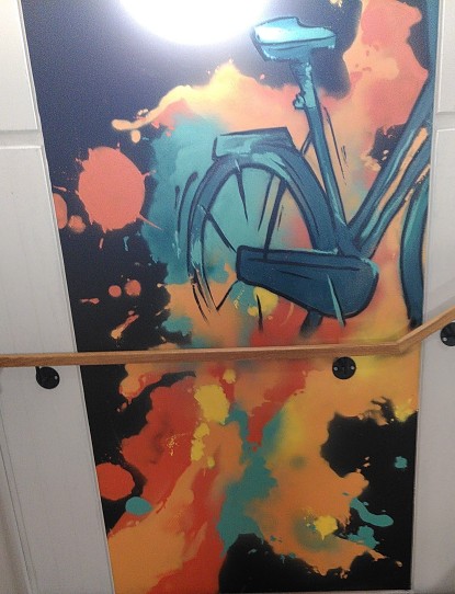 Ich weiß natürlich nicht wer hinter der Kunst steckt und ob es da ein Konzept vorher gab oder freie Hand gelassen wurde. Auf jeden Fall fand ich es schön mal ein Fahrrad in der Kunst zu sehen. Zumal das ja zu einem Hotel direkt am Bahnhof auch sehr gut passt, denn Fahrrad und Bahnverkehr passen gut zusammen.