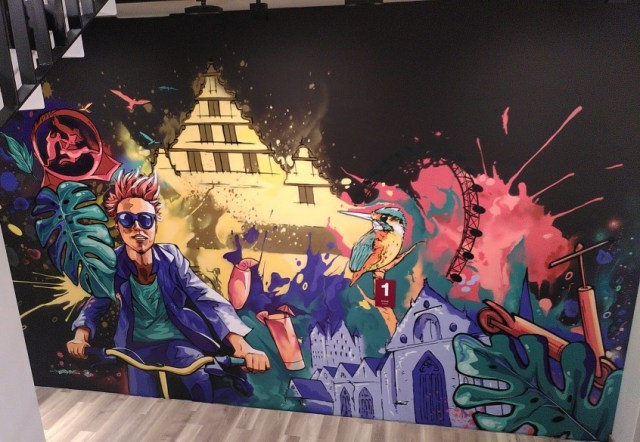 stilistisch mit den anderen Kunstwerken ergibt dies ein poppiges Werk, was zu dem modernen Bauwerk passt und dieses aus meiner Sicht aufwertet.