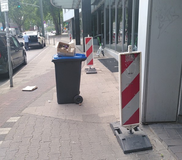 Das Bild entstand, als ein Ihscooter den Weg am Hotel vorbei blockierte und man zusätzlich noch ein weitere gefährliches Hindernis in den Weg gestellt hat, eine Mülltonne. Eine Woche vorher standen dort ganz viele Ihscooter. Manchmal stehen auch Drogensüchtige im Eingang. Dabei wäre die Lösung so einfach. Taxihalt entfernen, die können auch in die Tiefgarage fahren und den Radweg begradigen und den Gehweg ebenfalls.